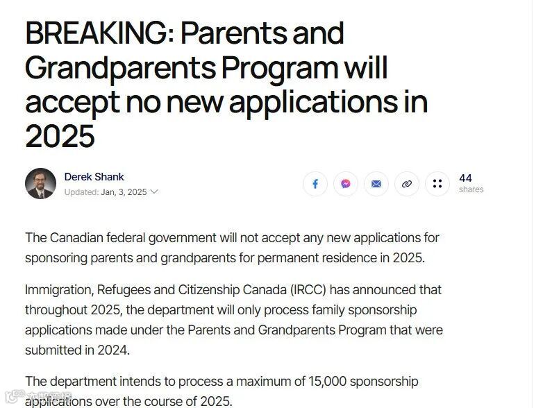 据CIC 消息,加拿大联邦政府2025年将不再接受任何新的父母和祖父母团聚移民的申请。