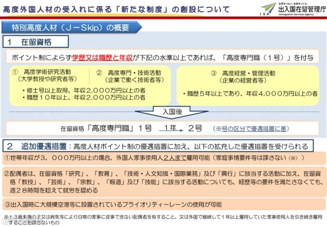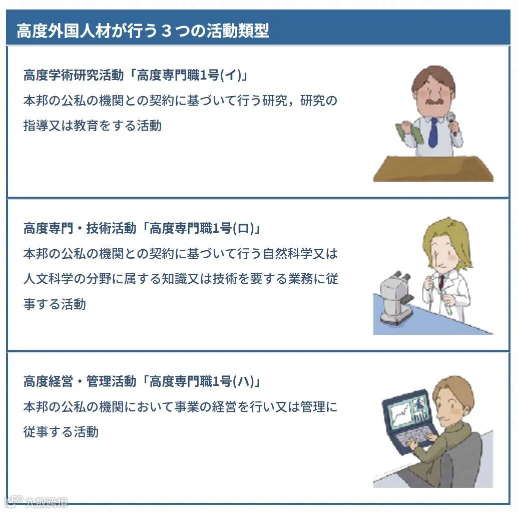 日本政府为了吸引和促进高技能外国人才的流入,于2012年5月7日,由法务省入国管理局实施了《日本高级人才积分制度》,并配套了一系列优惠政策。该制度主要针对以下三类专业人才: