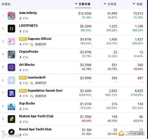 据dappradar数据显示,最近24H排名前10的收藏品中,有7个无论是在用户、交易额还是交易数量上均出现上扬趋势。