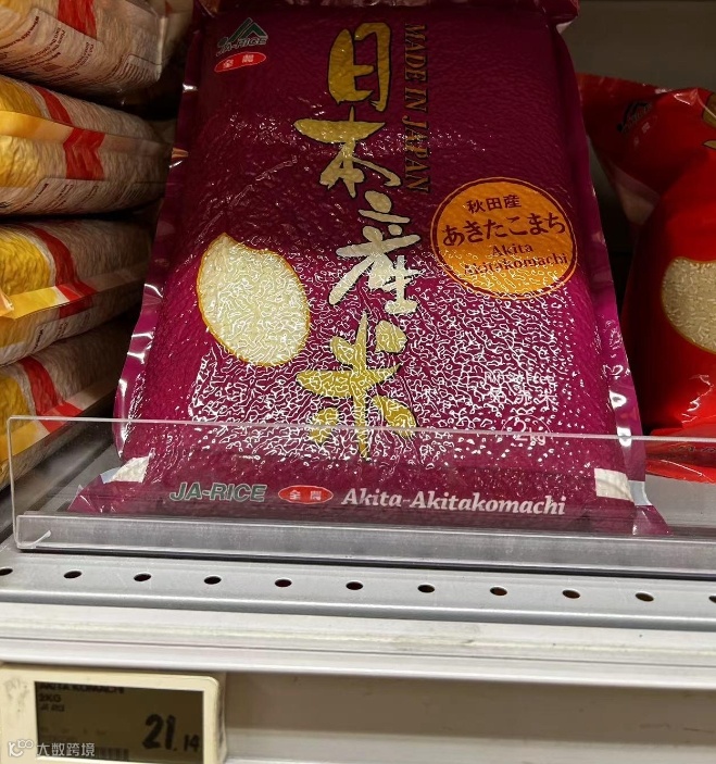 日本米:5公斤的日本秋田县产米售价116人民币(21.14新币),尽管标签为日本米,但产地可能是台湾或越南。