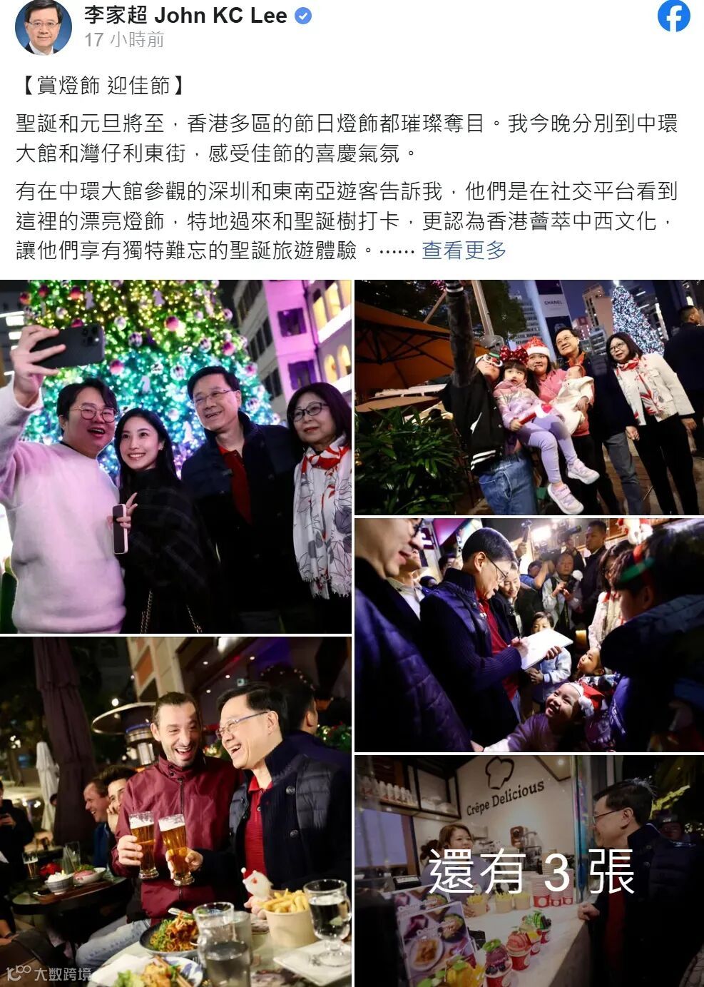 如此浓烈的圣诞氛围,连香港特首李家超也被吸引前来。昨晚,李家超与夫人一同走访了中环大馆和湾仔利东街,和游客及市民互动,并祝大家圣诞快乐,引来市民纷纷拍照留念。