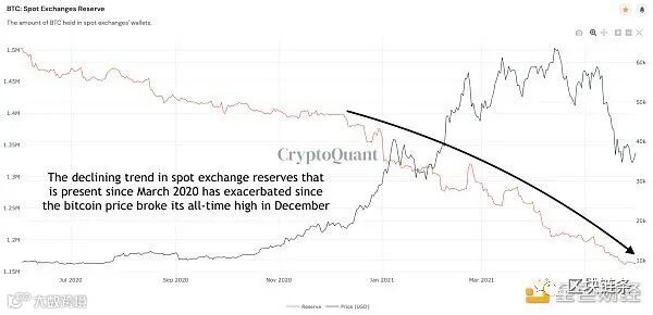 2020年3月,一场由宏观经济驱动的大规模价格暴跌清除了比特币市场的所有杠杆,并创造了更有机的市场条件,为2020-2021年的牛市奠定了基础。从那时起,我们见证了中心化交易所比特币储备减少的明显趋势,表明正在形成大的比特币供应短缺。在比特币价格突破2017年的历史新高之后,这种趋势在不提供衍生品交易的纯现货交易所加速了(图 6)。