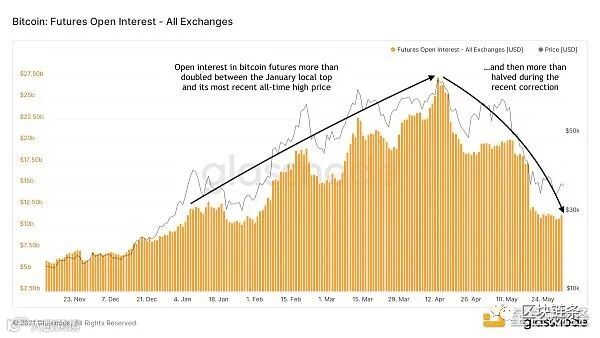 衍生品交易所的比特币储备(至少部分)作为(高)杠杆交易的抵押品。在2021年1月局部最高点之后的几个月里,比特币期货的未平仓量增加了一倍多(图 8),这表明市场参与者越来越愿意承担风险——这可能是市场兴奋的迹象。