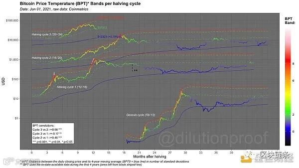 图1:每个减半周期的比特币价格温度带(Bitcoin Price Temperature Bands)