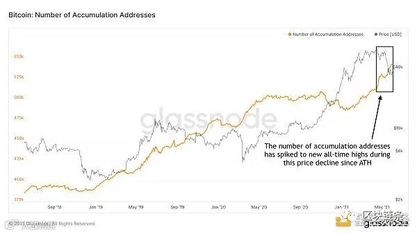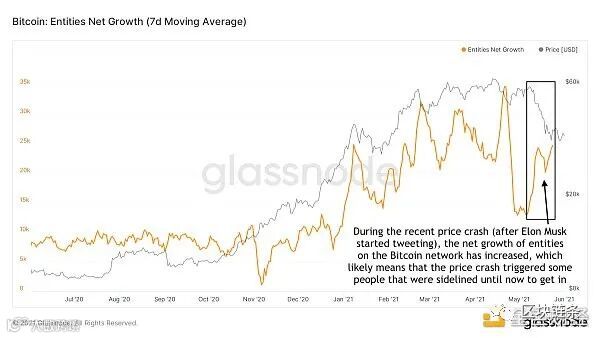 最后,最近比特币网络上实体净增长的飙升表明,在价格暴跌期间,加入的实体多于离开的实体,这也表明较低的价格诱使一些人买入(图 20)。