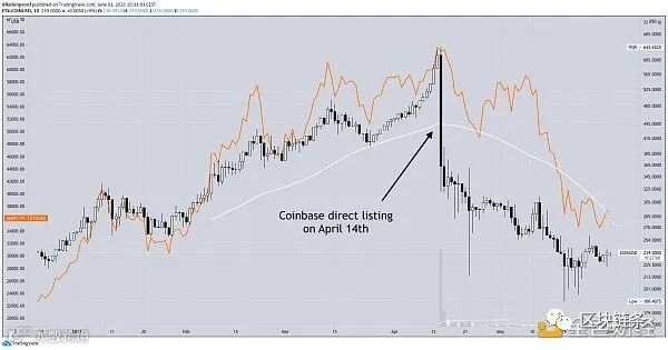 图 11:Coinbase(COIN,黑色和白色)和比特币(BTC,橙色)价格