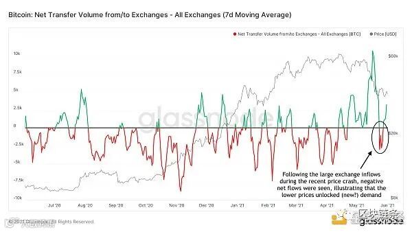在最近的市场调整期间,交易所看到大量的短期持有者净流入,头寸丢失(图 16)。随着价格下跌,从/到交易所的净转移量也在下降,甚至在价格下跌接近尾声时再次变为净负值。这表明较低的价格引发了(新的?)需求,增加了买家逢低期间继续介入的信心。