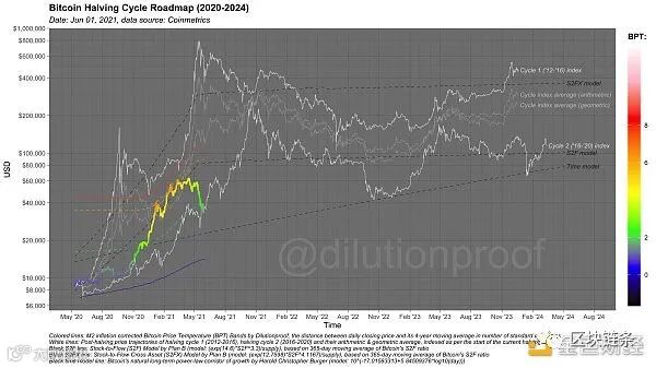 无法保证比特币价格一定会模仿其之前(减半)周期的轨迹。尽管如此,图23中显示的S2F和S2FX等模型、基于时间的模型或更简单的先前周期指数可能有助于,粗略了解会否再次重演比特币的四年周期。