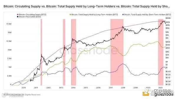 图3:比特币价格(黑色)和总量(蓝色)、长期持有者(绿色)和短期持有者持有的比特币(粉色)