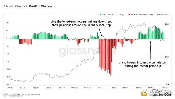 图5:比特币价格(黑色)和矿工净头寸变化(绿色和红色)