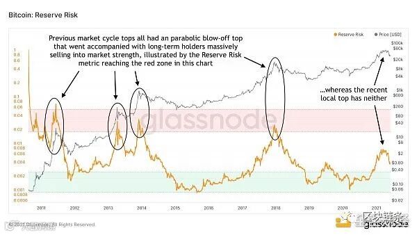 图15展示了一个例子。与之前的市场周期不同,前几个市场周期的顶部都以指数性突破为标志,同时长期持有者大量抛售,而本轮周期(到目前为止)两者都不是这样了。当然,本轮周期不必与之前的周期相似,但这确实说明,如果当前周期确实以目前形态结束,那将不是非常典型的周期。