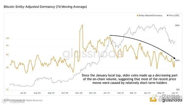 自2021年1月局部顶点以来,可以看到老币对链上交易量的影响程度有明显的下降趋势(图 13)。这意味着最近的价格变动越来越多地归因于相对年轻的市场参与者。