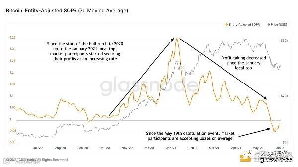 图2:实体调整后支出产出利润率 (Entity-Adjusted Spent Output Profit Ratio,SOPR) 的7天移动平均值