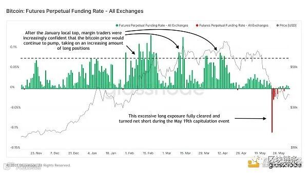 从图9可以看出,大部分未平仓合约代表多头头寸。当市场在一个方向上被大量(过度)杠杆化时,大型市场参与者就有明显的动机推动价格相反而行。当比特币价格跌破多头头寸的平仓价格时,交易所可以强制卖出该头寸,造成更大的下行压力,可能形成多头平仓的连锁效应,同时价格急剧下跌,这正是我们2021年5月19日所看到的。