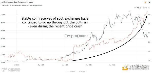 对(现货)比特币敞口的持续需求的另一个可能迹象是现货交易所的稳定币储备持续增加(图 18)。