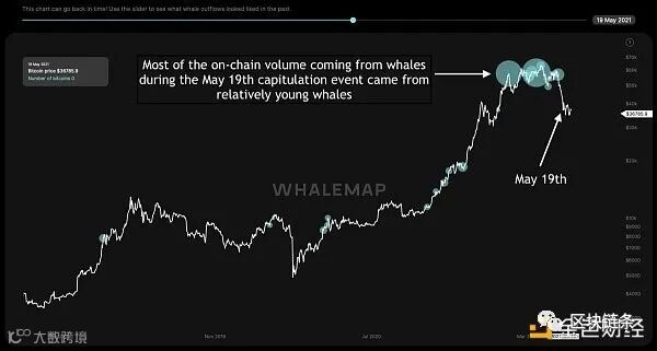 当细看比特币市场中最大的参与者(“鲸鱼”)的链上运动时,也很明显,大多数链上运动是由年轻的鲸鱼完成的。图14中显示了一个示例,其中绿色圆圈突出显示了在2021年5月19日大跌期间在链上进行交易的鲸鱼地址(数量)。这些链上运动很可能是这些年轻鲸鱼们 (1) 本身引发价格暴跌,(2) 出于焦虑而抛售,(3) 他们的多头头寸被清算,以及 (4) 以较低的价格回购税收优惠(“税收收获”)。