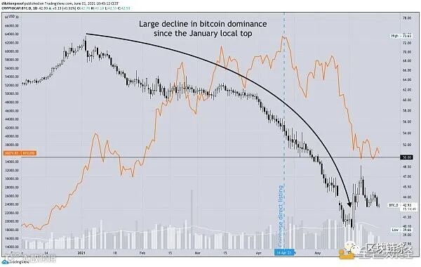 图 12:比特币主导地位(黑白)和价格(橙色)