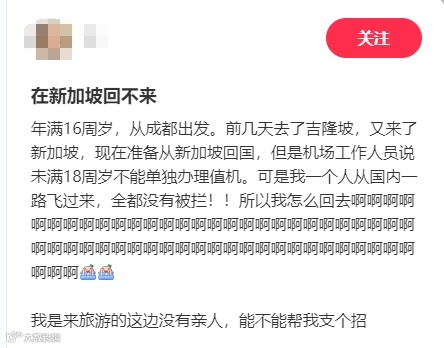 近日,一名16岁的网友在社交平台上发出了一则求助帖,引起了广泛关注。他从成都出发,经过吉隆坡,最终抵达新加坡旅游,但在准备从新加坡回国时却遭遇了机场工作人员的阻拦。工作人员表示,由于他未满18周岁,不能单独办理值机手续。这让他陷入了困境,因为之前在国内到吉隆坡再到新加坡的旅程中,并未遇到任何阻碍。