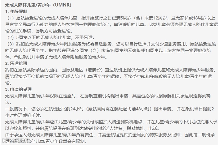 另外厦航仅接受不换机的情况下的无成人陪伴儿童/青少年的运输,不接受中转和多航段的无人陪儿童/青少年的运输。