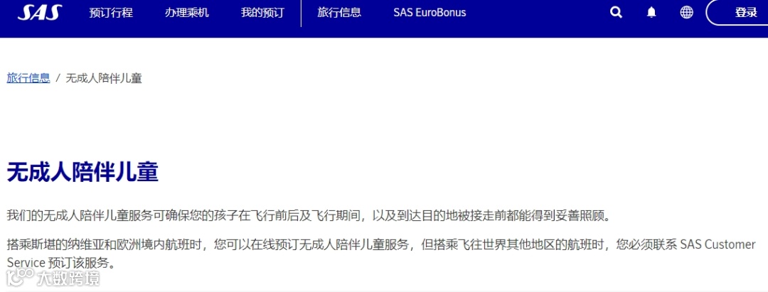 搭乘斯堪的纳维亚和欧洲境内航班时可以在线预订无成人陪伴儿童服务,但搭乘飞往世界其他地区的航班时,您必须联系 SAS Customer Service 预订该服务。