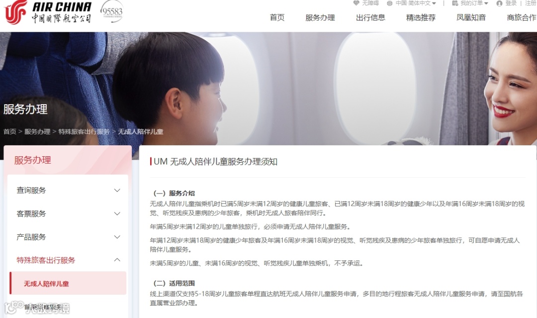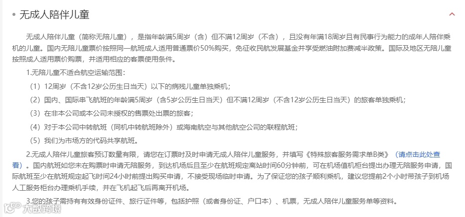凡是同一航班或舱位无成人陪伴单独出行的,年龄介于 5 至 17 岁(未满 18 岁)的未成年乘客,将被视为无成人陪伴的儿童。出于安全考虑,未满 5 岁的儿童不得作为无成人陪伴的儿童单独出行。年龄为 5 至 11 岁(未满 12 岁)的乘客,必须申请无成人陪伴服务。年龄为 12 至 17 岁(未满 18 岁)的乘客,可视情况申请无成人陪伴服务。