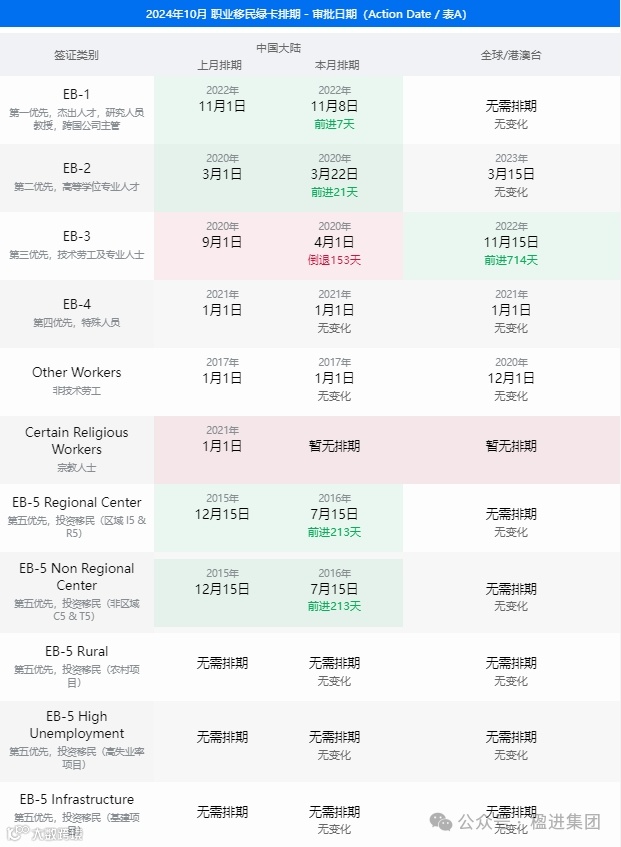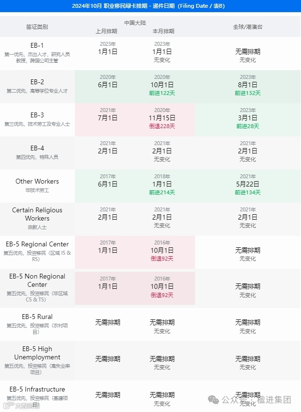 职业移民排期表A:EB-1前进7天、EB-2前进21天、EB-5前进213天、EB-3倒退153天。