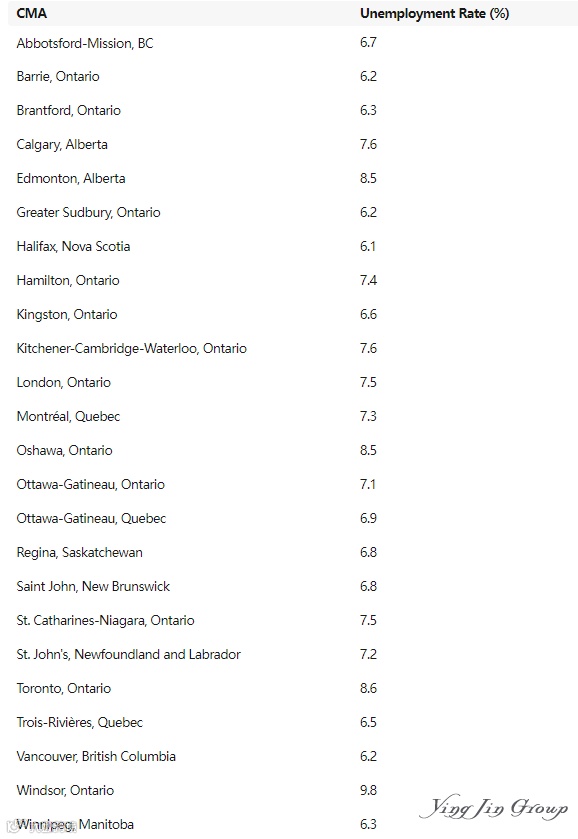 根据加拿大统计局的数据,截至2024年9月6日,失业率等于或高于6%的CMA包括但不限于:
