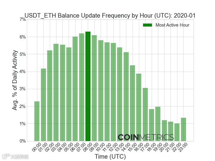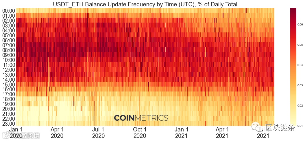USDT_ETH 的日常使用模式最近也发生了变化。从历史上看,大部分USDT活动主要发生在亚洲工作时间。下面的热图显示了最常使用在以太坊 (USDT_ETH) 上发行的USDT的时间。较深的红色对应于每日活动百分比较高的小时数(UTC)。