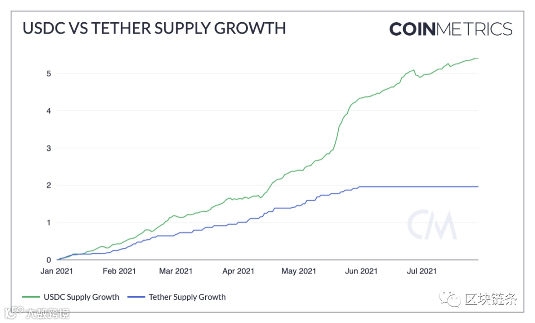 USDC的供应量在 2021 年从年初的约 40亿美元 增长到今天的超过 260亿美元。在 5 月加密货币崩盘后,USDC 的增长加速——自 5 月 11 日以来,USDC 的总供应量增加了约 75%。Tether (USDT) 仍然是稳定币市场的主导者,总供应量超过 640亿,但自 5 月以来 USDT 增长趋于平缓。USDC 是仅次于 Tether 的第二大稳定币,其在稳定币总供应量中的份额正在增长。
