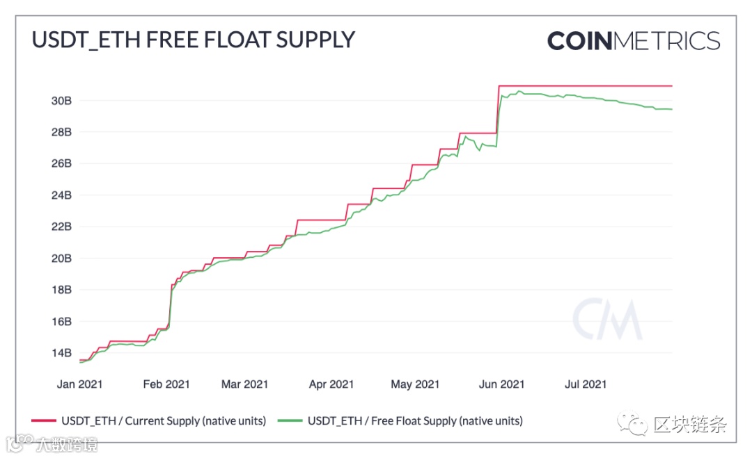 尽管 Tether 的总供应量增长停滞不前,但其自由流通量供应量在上个月已经有所减少。“自由流通量”供应量是由 Coin Metrics 开发的一种指标,不包括被视为非流动性的供应量。Tether 自由流通供应量的减少代表已被赎回并送回 Tether 储备的供应量。这种自由流通量的减少在以太坊上尤为明显——在过去 30 天内,以太坊上发行的 Tether (USDT_ETH) 的自由流通量供应量减少了约 10亿,而总供应量保持不变。