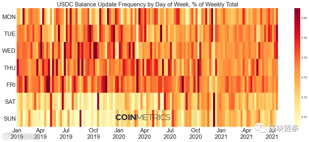 采用 USDC 和其他稳定币的原因有很多,但与传统结算基础设施(例如 Fedwire)相比,稳定币的一个主要好处是它们运行在 24/7、365 全天候运行的加密本地支付轨道上。下面的热图分解了 USDC 的活动(按星期几)。链上数据显示,USDC主要在工作日使用,但在传统基础设施基本不可用的周末也有一些活动。