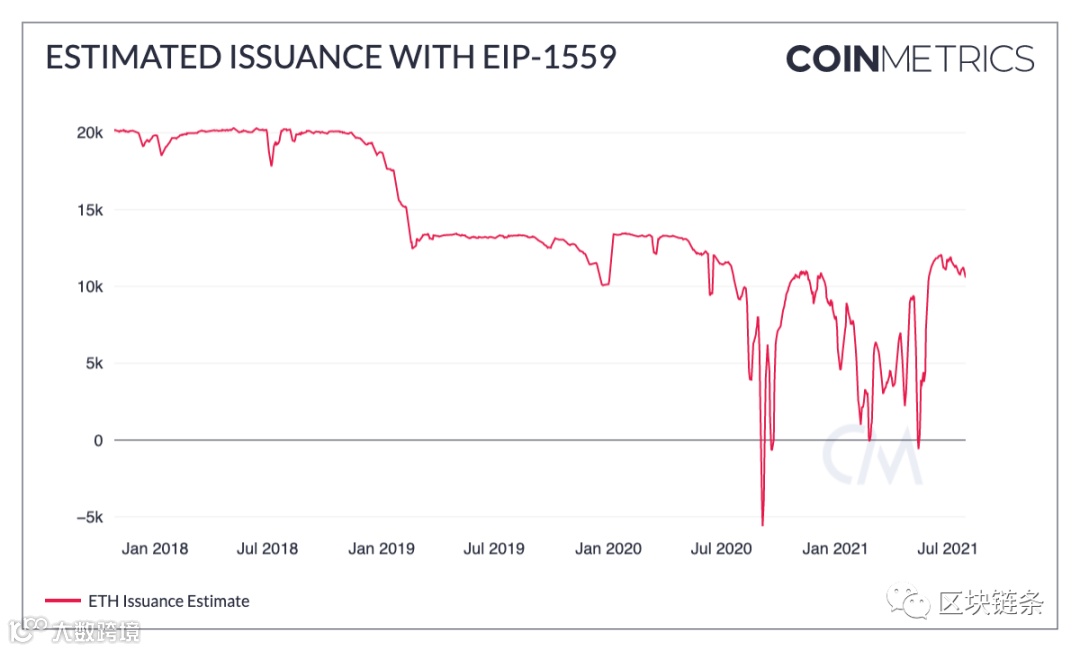 基本费用将被销毁而不是支付给矿工,这可能是 EIP-1559 中讨论最多的部分。这对以太坊的供应经济学来说是有希望的,因为它将永久移除一些 ETH 并降低供应通胀。使用一些基本假设,其中 75% 的费用被销毁,下图展示了使用 EIP-1559的ETH 发行供应的历史情景。请注意,在网络拥堵严重的时期,每日发行量可能会变为负数。