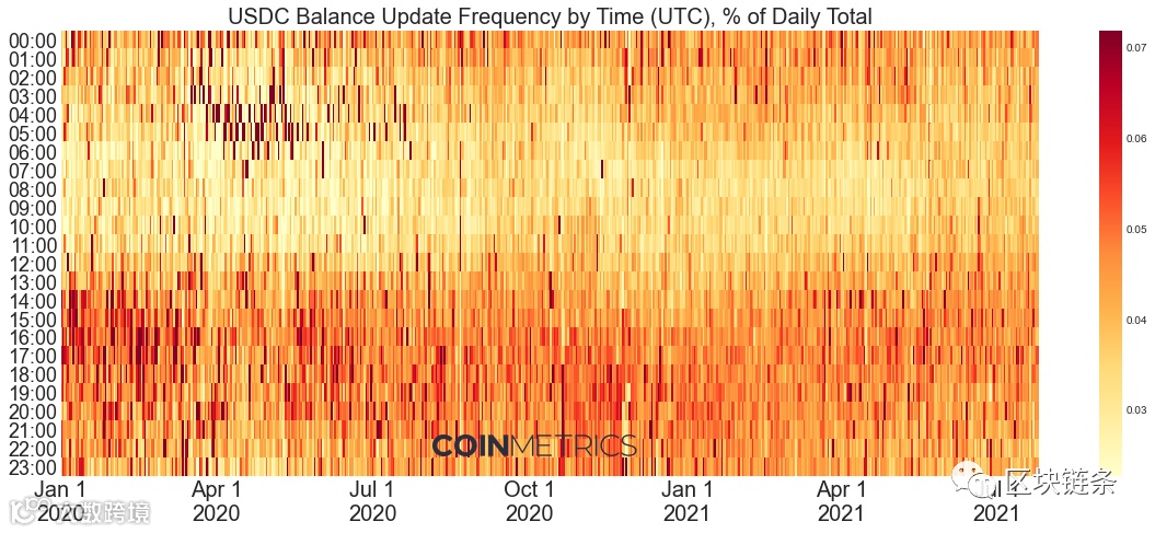 相比之下,USDC 的活动往往遵循美国市场时间,尽管它的分布稍微更加分散。大多数日常活动往往在 14:00 到 22:00 UTC 之间(就上下文而言,美国股市在 14:30 UTC 开盘并在 21:00 UTC 收盘)。