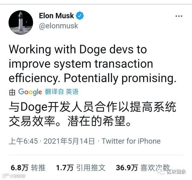 特斯拉亿万富翁埃隆·马斯克在今天早上(5月14日)的推特上表示,他正在“与狗狗币的开发者们合作,以提高系统交易效率”,并补充说狗狗币“有潜力”。在此之后,狗狗币的价格在过去24小时内上涨了约30%。