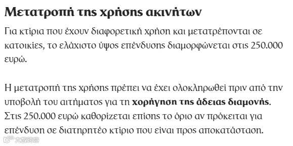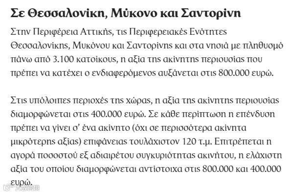 修正案要求第三国公民授予 5 年居留许可(黄金签证),需满足一定的条件。希腊所有地区的房地产价值为40万欧元。但这并不涉及阿提卡、塞萨洛尼基、米科诺斯、圣托里尼和人口超过3100人的岛屿,这些岛屿的价值必须增加到80万欧元。