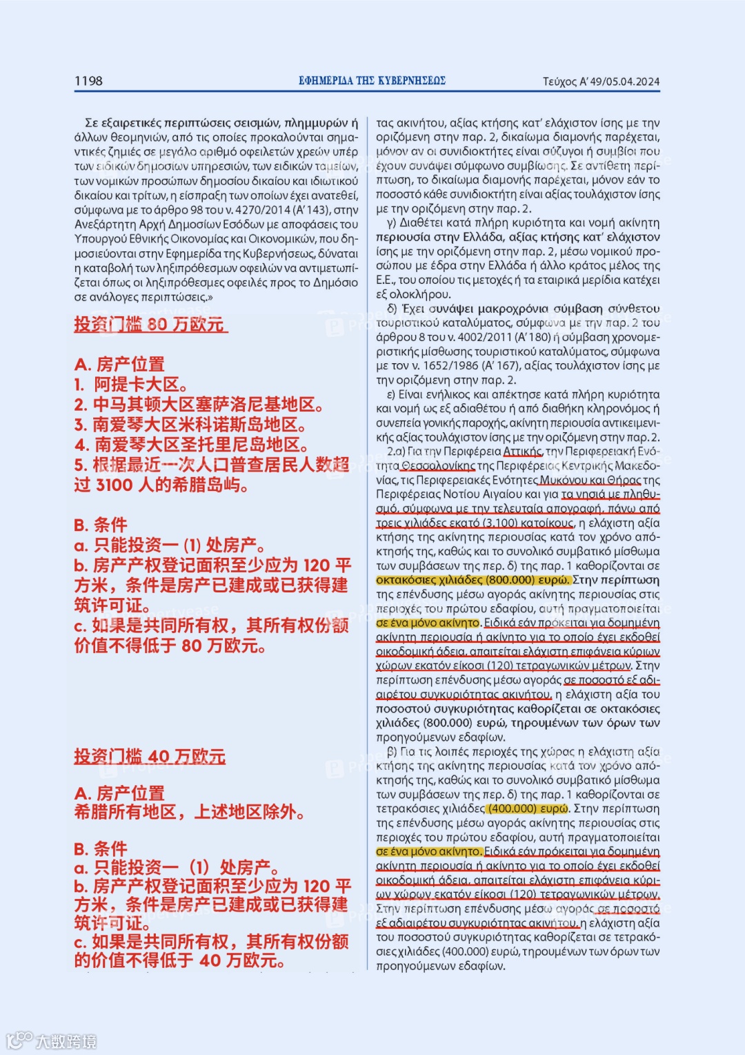 投资门槛80万欧元:阿提卡大区、中马其顿大区塞萨洛尼基地区、南爱琴大区米科诺斯岛地区、南爱琴大区圣托里尼岛地区、根据最近一次人口普查居民人数超过 3100 人的希腊岛屿涨至80万欧元,且限买1套120平米以上住宅。