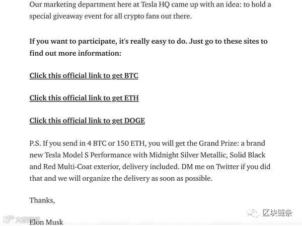 现在已被删除的Medium页面还声称,特斯拉的营销部门组织了这次赠品活动。发送4个比特币或150个ETH的用户将获得最新特斯拉Model S的大奖。