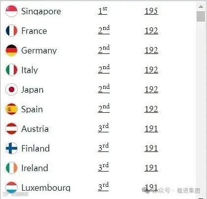 2. 法国、德国、意大利、日本、西班牙(192个免签或落地签目的地);