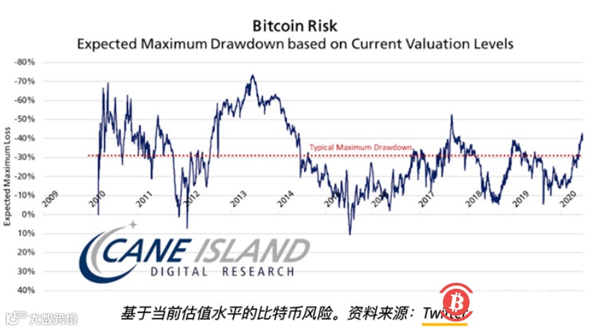 “比特币的风险正在接近2017年的水平。在这个价格买入的投资者可以预期在未来某个时候损失40%的投资。然而,典型的最大缩水幅度是30%,因此这一风险与平均水平相比只是略有提升。”