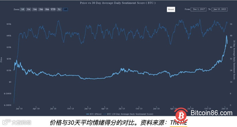 观察比特币的30日日均情绪得分可以看出,尽管比特币出现回调,但平均得分仅较近期高点略有下降,且远高于以往下行周期中的低点。