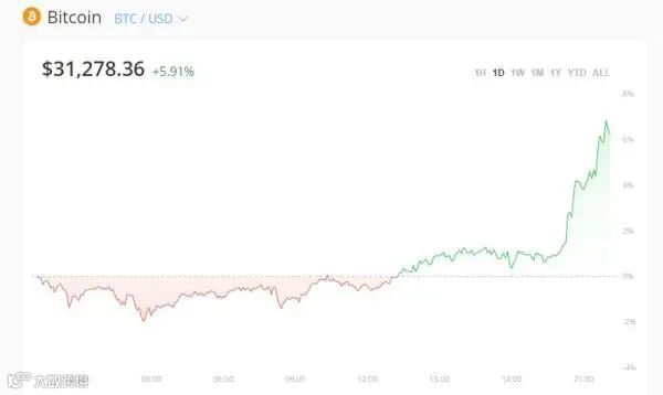随后,比特币持续走强,日内大涨6%升破31000美元/枚,续刷历史新高。