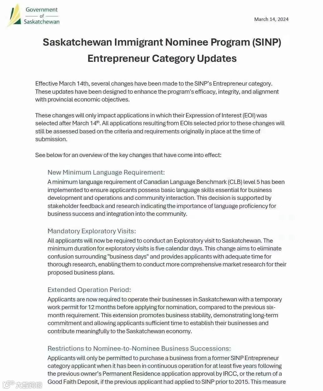 自2024年3月14⽇,加拿大萨省的企业家移民提名项目(SINP)突然宣布立即增加八大项新政,新政如下: