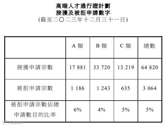 孙玉菡24日在立法会表示,高才通计划自推出以来反应踊跃。截至去年十二月底,共收到约65000宗申请,当中近51000宗获批,其中约36000人已来港,加上经其他人才入境计划获批的申请,去年总计约90000名人才抵港,超出了政府订立每年至少输入35000名人才的目标。而截至去年十二月底,高才通计划约有3000宗被拒,占总申请数目约5%。申请被拒的主要原因是申请人未能符合相关资格准则,包括未能符合A类申请的年薪要求,或并非毕业于合资格大学综合名单中的院校等。