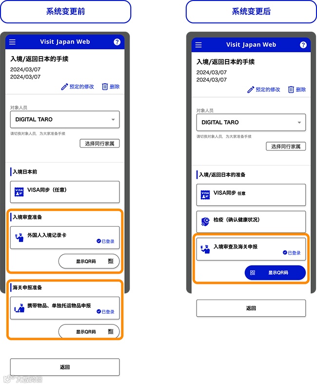 Visit Japan Web系统更新后,之前向入境旅客显示的“外国人入境记录”及“携带物品、单独托运物品申报”两个菜单,合并成了“入境审查及海关申报”一个菜单。系统变更之前的二维码已不能使用,所以如果之前已经填报的旅客,需要重新登录Visit Japan Web生成二维码哦。