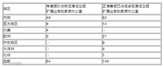 投资推广署成立的家族办公室团队为有意在香港成立家族办公室的客户提供一站式支持服务。根据团队的统计数据,超过650个家族办公室向该团队查询了在香港成立的相关事宜。由香港专责团队协助在港设立或扩展业务中,内地已有49个家办已在港开展业务,正准备或已决定会在港设立或扩展业务的家族办公室有82个,这些家族办公室涉及到各个行业,包括金融、专业服务等。