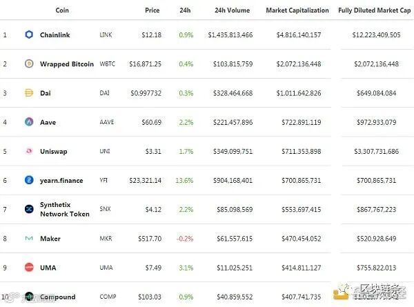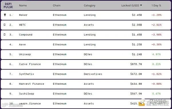DeFi项目锁定资产前十排名及锁仓量,数据来源:Defi Pulse