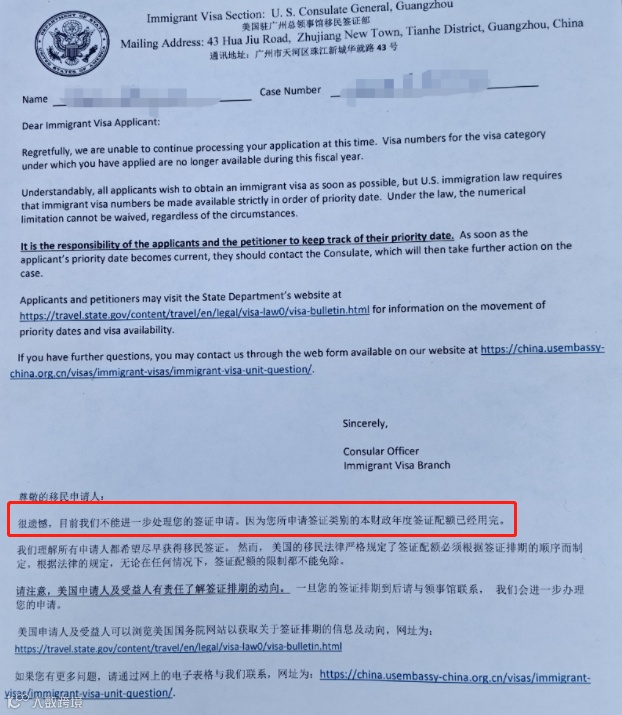 美国新财年将于10月1日开始,2023财年的最后一个月,在广领馆面签的EB-5投资人收到了如下通知:面签通过,但是因为今年EB-5签证配额用完,要等2024财年再贴签了。