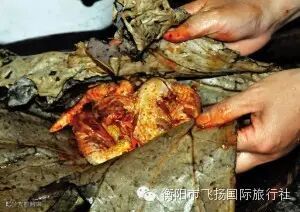 8、敲掉黄泥,翻开荷叶,金灿灿、嫩酥酥的鸡肉映入眼帘。