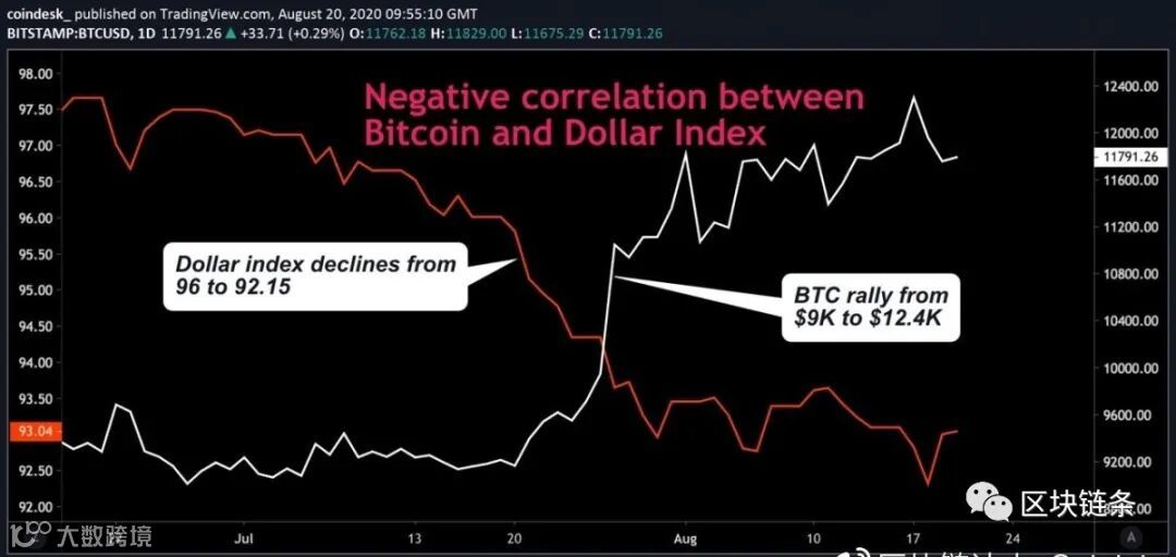 根据上图,美元指数在7月底曾从96下跌至92.15,正好与从9,000美元上涨至12,400美元的比特币交错。值得注意的是,过去一周美元反弹走强,而比特币则在周一经历画门下跌行情。
