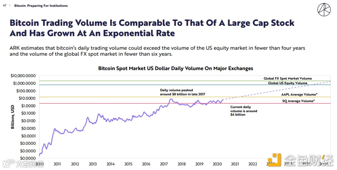 ARK估计,四年内比特币的日交易量可能会超过美国股票市场的交易量,在六年内超过全球外汇现货市场的成交量。